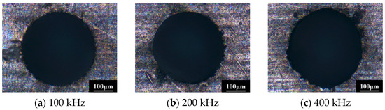 When the laser power and Dove prism rotation speed remain constant, the instantaneous power density will be affected by the laser repetition frequency. As the repetition frequency increases, the number of pulses increases, and the overlap rate of the light spot increases, but the energy of a single pulse decreases; that is, the instantaneous power density at a certain area along the cutting path will decrease, which prefigures that the processing quality at the outlet edge of the hole will also decrease. Figure 9 shows the processing results of changing the laser repetition frequency, which well confirms the above conclusions. If the rotation speed of the Dove prism is 2000 rpm when the repetition frequency is 100 kHz, the overlap rate of the laser spot is 0, and there is no overlapping area between the two adjacent laser pulses, but the morphology of the hole exit is better. When the repetition frequency is 400 kHz, the overlap rate of the spot is 45.49%, but the morphology of the hole exit is poor. This is mainly because when the repetition frequency changes from 100 kHz to 400 kHz, the peak power density of the laser will decrease to a quarter of the original. Although the spot overlap rate increases about 45%, the instantaneous power density still decreases in a certain processed area. The instantaneous power density directly determines whether the material can be removed quickly.