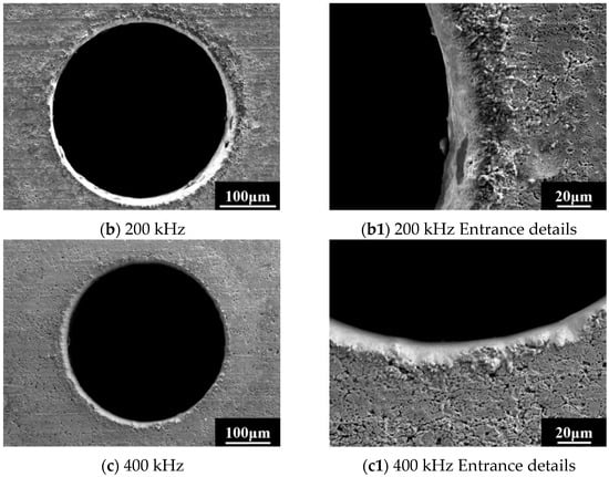 Based on the discussion above, if the speed of the hollow motor is fixed at the state with a good dynamic balance, and in order to obtain the better outlet morphology, a lower repetition frequency should be selected in combination with higher laser power. But the entrance morphology is also something we need to consider comprehensively. Figure 10 shows the original inlet morphology of the micro-hole obtained by different repetition frequencies at a power of 10 w. It can be observed that the lower the repetition frequency, the more severe the splashing phenomenon on the surface. A large amount of melted and re-solidified slag accumulates on the inlet surface, while these defects are much milder when the repetition frequencies are higher. This is mainly because the lower the laser repetition frequency, the higher the peak power density, and the more intense the interaction between the laser and the material. The higher the temperature and pressure inside the molten pool, the greater the amount of spraying towards the surroundings. In the case where the slag discharge channel has not yet been opened, the sprayed slag will accumulate on the inlet surface, leading to a deterioration of the entrance morphology. After the outlet is opened, the slag can be discharged in a timely manner with the protective gas, so it does not have significant impact on the morphology of the outlet. During the actual drilling process of blade air film holes, a layer of protective material is pre-coated on the surface of the blade to prevent oxidation and discoloration of the substrate. After the processing is finished, the coating material is removed, and part of the slag at the hole inlet is also removed, and the morphology of the inlet edge is improved. Therefore, the influence of repetition frequency on the inlet morphology can sometimes be disregarded in the actual drilling process.