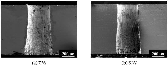 Figure 11 shows the cross-sections of gas film holes processed with different laser powers at a laser repetition frequency of 400 kHz. From the figure, it can be observed that there are recast layers on the sidewall surfaces. The presence of the recast layer increases the roughness of the sidewall surface. The severity of the recast layer near the inlet and outlet is different, and the re-condensation phenomenon near the outlet is significantly more severe than that near the inlet. This is mainly because the processing depth at the outlet is larger. The laser instantaneous power density is reduced due to the obstruction of the hole wall. Then, the thermal effect is enhanced, and the proportion of material removed as liquid increases, thereby aggravating the surface re-condensation phenomenon after cooling. In addition, it can also be found that the lower the power, the more severe the recast defects near the outlet. This is because the decrease in power leads to a decrease in instantaneous power density, thereby enhancing the thermal effect and removing the material in a molten state. This corresponds to the observed deterioration in low-power outlet morphology in the previous section. Another phenomenon that needs to be noted is that the inlet diameters of the micro-holes are the same under three different laser powers, but the outlet diameter of the micro-hole increases under low power, such as 7 W, which is related to the melting removal state of the material near the outlet under low power. The reduced power further leads to the enhancement of the heat effect near the outlet, and the liquid removal mechanism will cause the outlet to expand and reduce the orifice roundness. Therefore, it can be seen that low laser power not only leads to the deterioration in the morphology of the outlet but also affects the dimensional accuracy of the outlet. Therefore, it is advisable to avoid drilling gas film holes at low power as much as possible.