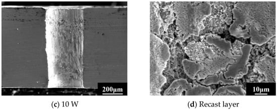 In recent years, laser processing technology has gradually become a research hot spot in the microstructure machining of aircraft engines. The long-pulse laser is usually not the ideal tool for micro-hole drilling [15,16]. The interaction time between the long-pulse laser and the processed material is so long, the heat will diffuse around and inside the processed area. At the same time, the peak power of the long-pulse laser is much lower than that of the ultra-short-pulse laser, which means that the heat absorbed by the material cannot cause rapid evaporation; instead, most of the material is melted and blown off by the nozzle. Such long action times and melt-removing mechanisms result in the formation of a larger heat-affected zone and a thicker layer of recast. These defects are not allowed for high-speed rotating components such as blades.