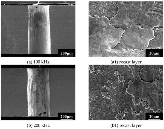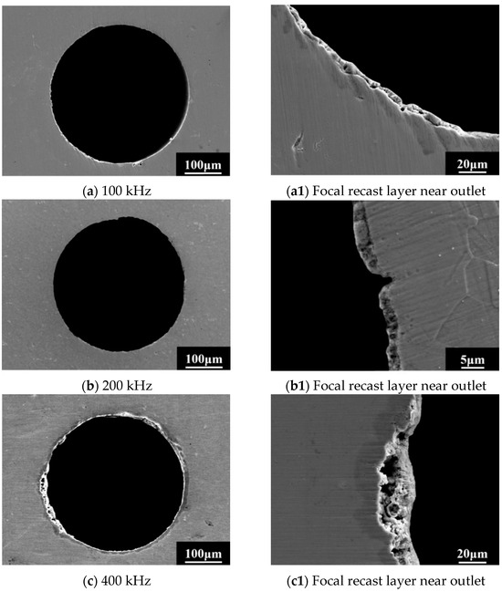 As shown in Figure 11, it can also be observed that the roughness of the side wall is relatively large under high laser repetition frequency, which has a serious impact on the airflow state inside the gas film holes. Figure 12 shows the drilling results with the laser repetition frequency of 100 kHz and laser power of 10 w. As shown in Figure 12, reducing the repetition frequency can improve the roughness of the hole wall surface and change the recast layer distribution on the sidewall surface. The higher repetition frequency corresponds to the larger thermal effect, and the surface recast layer undergoes multiple melting and solidification processes, resulting in the increase of surface roughness, as shown in Figure 12b,b1. Although the recast layer still exists at the repetition frequency of 100 KHz, the continuity of the recast layer is good, and the surface of the recast layer is relatively flat, with almost no repeated processes of re-solidification after multiple melting; thus, the surface of the hole wall is relatively smooth, as shown in Figure 12a,a1. This is all attributed to the higher instantaneous power density of the laser corresponding to low repetition frequency and the consequent rapid material removal by evaporation with lower thermal effects.