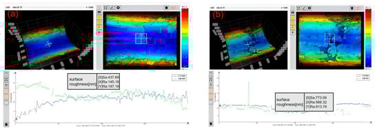 Surface roughness near the outlet with different laser repetition frequencies. (a) Sidewall surface with repetition frequency 100 KHz; (b) sidewall surface with repetition frequency 400 KHz.