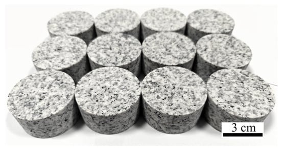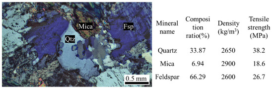 The granite specimens used in this study were collected from Nan an, Fujian Province. The granite has a density of 2.6 g/cm3, a porosity of 0.87%, and a longitudinal wave velocity of 5952 m/s. According to the recommended standard of the International Society for Rock Mechanics (ISRM) [27], the granite was processed into Brazilian discs with dimensions of ϕ50 mm × 25 mm, with an error of less than 0.2 mm (Figure 2). X-ray diffraction (XRD) analysis reveals that the mineral composition of the granite is primarily 6.94% muscovite, 24.21% quartz, 33.87% plagioclase, 32.42% sodium feldspar, and 2.57% other components. Furthermore, thin sections of the granite specimens were examined under a polarizing microscope (Figure 3), which shows that mica is mainly distributed between feldspar and quartz and that numerous primary microcracks exist within the mineral grains. The grain size ranges of quartz, feldspar, and mica in the granite are approximately 0.066–0.715 mm, 0.045–0.964 mm, and 0.052–0.437 mm, respectively. To ensure the reliability of the experimental results and the consistency of the sample composition, all samples in the experiment were taken from the same original rock.