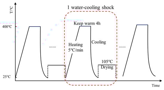 Heat Treatment Stage: The prepared specimens were placed in a muffle furnace and heated to 400 °C at a heating rate of 5 °C/min [14,28,29], then held at this temperature for 4 h to ensure uniform heating of the granite specimens. After heating, the specimens were transferred to a constant-temperature bath for cooling and soaking for 1 h. Once cooled, any excess moisture on the granite surfaces was wiped off, and the specimens were placed in a constant-temperature drying oven at 105 °C for 24 h. This entire process is considered one cycle of water-cooling shock. Granite specimens were subjected to 1, 3, 5, and 7 cycles of water-cooling shock, respectively, with a schematic diagram of the 400 °C cyclic water-cooling shock illustrated in Figure 5. Finally, the heat-treated granite specimens were stored in sealed bags for subsequent experiments.