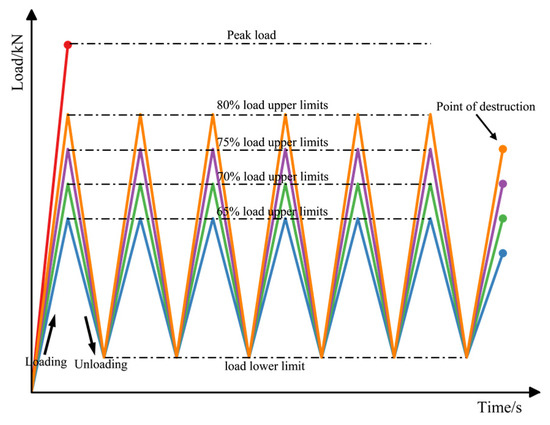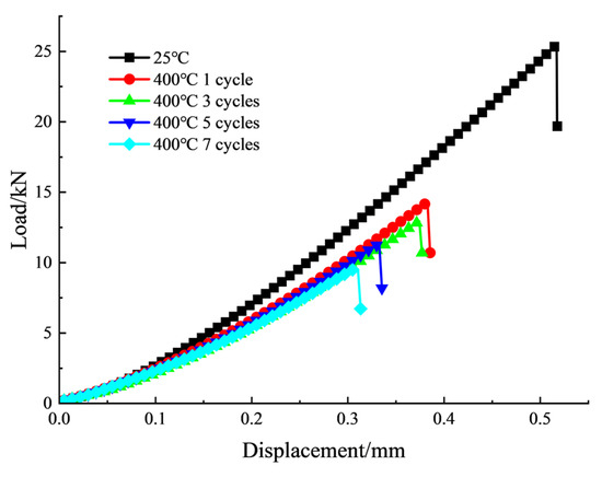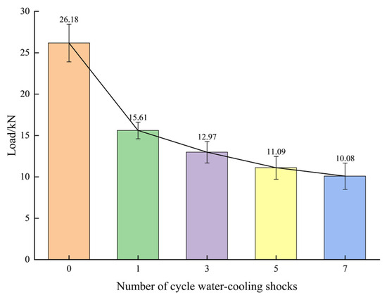 Brazilian Splitting Test: In order to establish appropriate parameters for the cyclic loading-unloading Brazilian splitting tests, conventional Brazilian splitting tests were first conducted in order to measure the peak load of granite specimens subjected to water-cooling shock at different temperatures, as shown in Figure 6. It was established that when rocks undergo fatigue failure under cyclic loading-unloading conditions, a threshold exists for the preset load upper limit [23,31]. Consequently, the present study selected 65%, 70%, 75%, and 80% of the peak load as the preset load upper limits for cyclic loading-unloading, with the target number of cycles set at 500 for all tests. To ensure effective contact between the specimen and the test fixtures, 0.3 kN was selected as the load lower limit. The cyclic loading-unloading path for the Brazilian splitting test is illustrated in Figure 7, and the tests were conducted under displacement-controlled loading at a rate of 0.5 mm/min. To ensure the accuracy and reliability of the test results, three parallel tests were performed for each condition, and the mean value was calculated.
