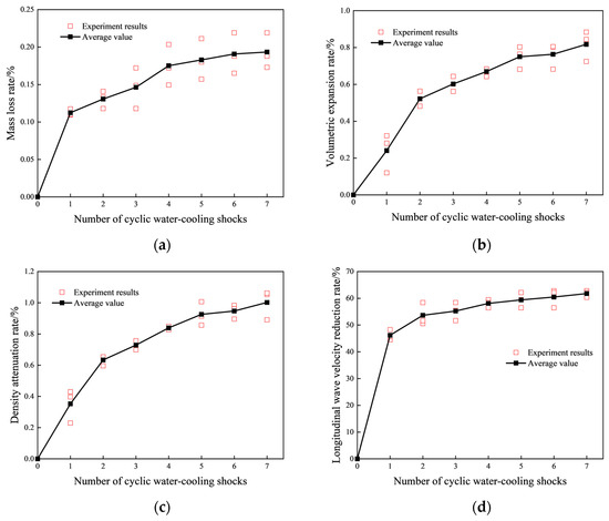 Cyclic water-cooling shock has certain effects on the mass, volume, density, and longitudinal wave velocity of granite. For quantitative analysis, the granite mass loss rate, volume expansion rate, density attenuation rate, and longitudinal wave velocity reduction rate were used to describe the variation characteristics of the corresponding physical parameters. The calculation formulas [30] are as follows: