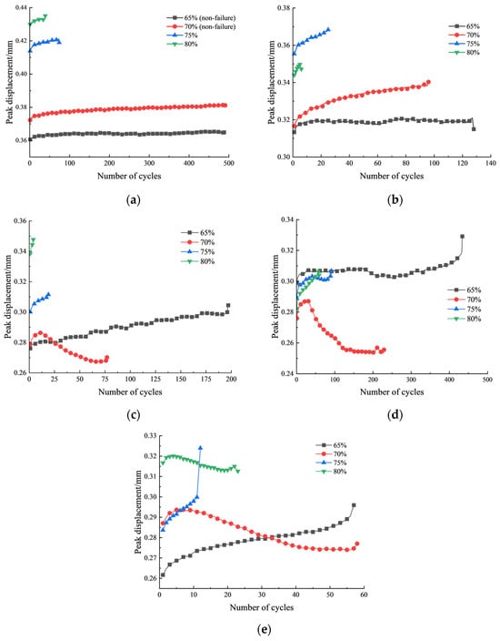 Peak displacement of granite under cyclic loading and unloading conditions versus the number of cycles of loading and unloading. (a) 0 Cycles of Water-Cooling Shock; (b) 1 Cycle of Water-Cooling Shock; (c) 3 Cycles of Water-Cooling Shock; (d) 5 cycles of Water-Cooling Shock; (e) 7 cycles of Water-Cooling Shock.