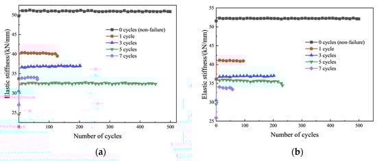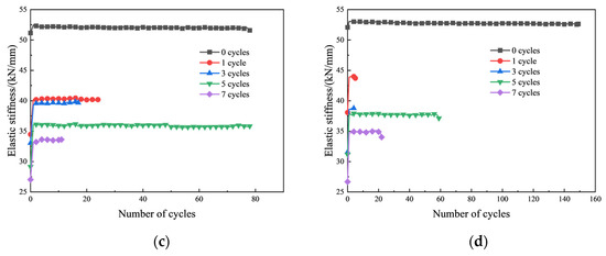 Figure 12 shows the variation of elastic stiffness of granite as a function of cyclic loading-unloading cycles in the Brazilian splitting test following different numbers of cyclic water-cooling shocks. The elastic stiffness initially increases markedly, then stabilizes, and ultimately decreases with additional loading-unloading cycles. The sharp initial increase in elastic stiffness is attributed to the compaction of internal pores during the first loading, which enhances granite density and its deformation resistance, accounting for approximately 80% of the total stiffness gain [38]. During the next few cycles, as the internal structure becomes progressively compacted, elastic stiffness increases slightly, corresponding to the rapid growth stage of peak displacement observed in Figure 13. Thereafter, although loading-unloading cycles continue, elastic stiffness remains nearly constant, corresponding to the slow growth stage of peak displacement. In the final cycles before failure, accumulation of internal damage due to continued cyclic loading causes elastic stiffness to decrease; at this stage, significant plastic deformation occurs in the granite, and peak displacement increases with cycle number until specimen failure, corresponding to the failure stage of peak displacement.