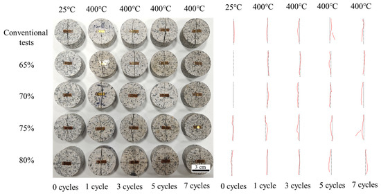 Figure 14 shows the macroscopic failure morphology of granite specimens subjected to 400 °C cyclic water-cooling shocks and subsequent cyclic loading-unloading Brazilian splitting tests. It can be observed that all specimens exhibit the typical failure characteristics of Brazilian splitting tests, namely, failure occurs along the diameter of the granite specimen in the direction of the applied load. Compared with the conventional Brazilian splitting tests, changes in the load upper limit have almost no effect on the macroscopic failure characteristics in the cyclic loading-unloading tests. However, as the number of cyclic water-cooling shocks increases (beyond three cycles), the principal fracture in the granite changes from a straight line passing through the center to an arc that deviates from the center. In specimens subjected to five and seven water-cooling shocks, secondary fractures are also observed. This is attributed to the alteration in the ductility of granite caused by the cyclic water-cooling shocks, whereby the splitting failure mode transitions from tensile failure to a mixed tensile-shear failure [46].