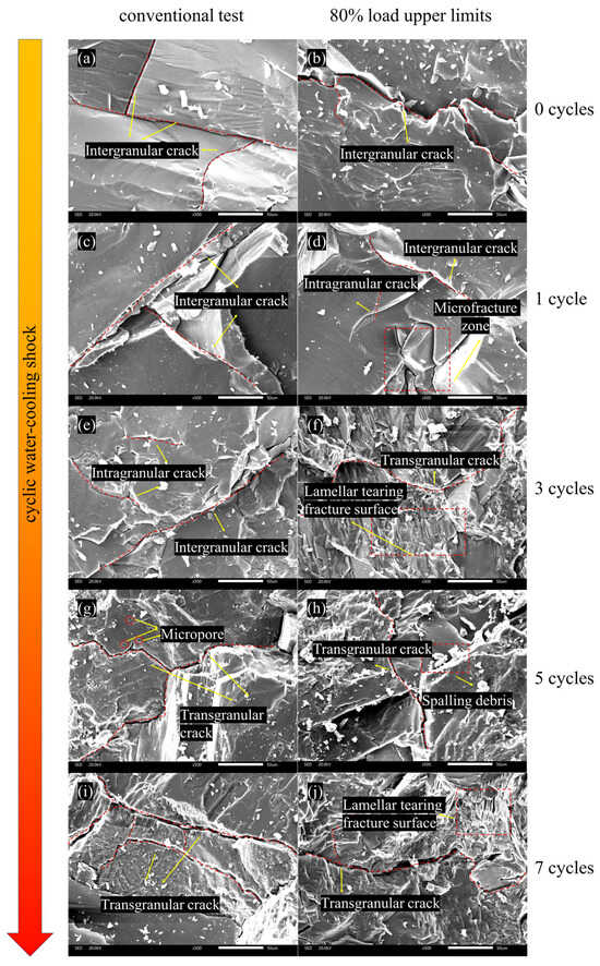 SEM image of granite specimen after 400 °C cyclic water-cooling shock. (a) conventional test and 0 cycles; (b) 80% load upper limit and 0 cycles; (c) conventional test and 1 cycle; (d) 80% load upper limit and 1 cycle; (e) conventional test and 3 cycles; (f) 80% load upper limit and 3 cycles; (g) conventional test and 5 cycles; (h) 80% load upper limit and 5 cycles; (i) conventional test and 7 cycles; (j) 80% load upper limit and 7 cycles.