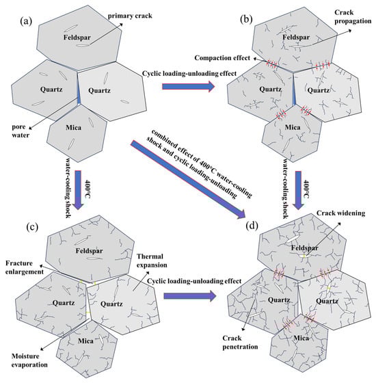 Schematic of the damage mechanism of granite under 400 °C cyclic water-cooling shock and cyclic loading-unloading. (a) natural state; (b) cyclic loading-unloading effect; (c) cyclic water-cooling shock; (d) combined effect of 400°C water-cooling shock and cyclic loading-unloading.
