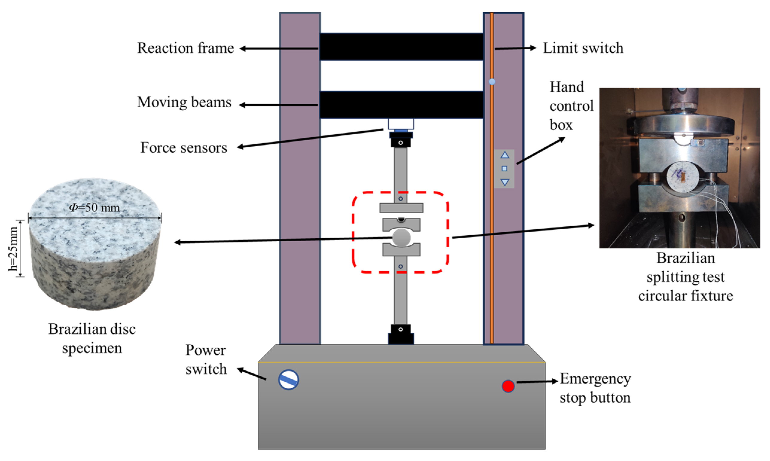 In this experiment, an electronic universal testing machine (Figure 4) was used to perform Brazilian splitting tests on granite specimens subjected to high-temperature thermal treatment. The apparatus mainly consists of a reaction frame, a movable crossbeam, a force-displacement data acquisition system, a manual controller, and Brazilian splitting fixtures [23]. The equipment has a maximum loading capacity of 300 kN, and its force sensing system employs a Transcell load sensor with a measurement accuracy of 0.04% FS, capable of collecting load and deformation displacement data at a frequency of 30 Hz during the test. The use of curved fixtures in the Brazilian splitting test prevents displacement of the granite specimens during the experiment and minimizes the influence of stress concentration on the test results [6].