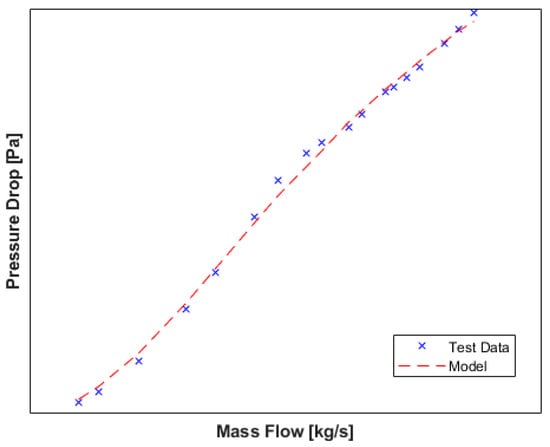 The boundary conditions for the compressor and turbine are defined by their pressure/expansion ratios and corrected air mass flow rates, which can be extracted directly from the 1D model results or calculated within the FCMT from the desired fuel cell operating conditions. The FCMT models the pressure drop of the air inlet, intercooler, fuel cell stack, and exhaust (illustrated in Figure 2) as fixed orifices based on Equation (1). The orifice area and discharge coefficient are summarised by a parameter () that is automatically generated based on experimental data, as shown in Figure 3.