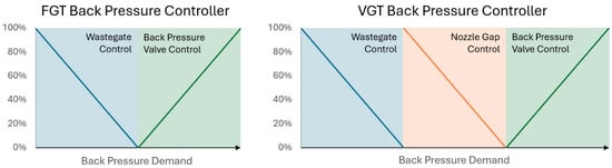 In the case of an FGT, only a back pressure valve and a wastegate are available. The wastegate and back pressure valve are represented by scaling the mass flow rate and expansion ratio (respectively) between 0% and 100% of the target conditions. To reduce the design space and simulation time, it is assumed that the wastegate does not open whilst the back pressure valve is active, and vice versa (Figure 4, left).