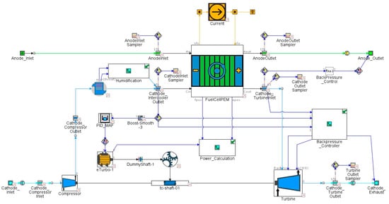 The 1D simulation model used for this work was developed based on the simulation model described in previous work by the authors [24], in which the air path design was adapted to use a VGT. The base model was developed in GT-Suite (v2022, Gamma Technologies, Westmont, IL, USA), and PEMFC calibration was performed using manufacturer data. As shown in Figure 5, this model follows a similar structure to the reduced model in the FCMT, but each component is modelled at a higher fidelity using 1D computational fluid dynamics (CFD), enabling the response of the fuel cell to varying pressure and flow rates to be evaluated. As with the FCMT, the mass flow rate is controlled using the electric motor, and the back pressure is controlled using the state-based control scheme shown in Figure 4. For more information about this model, including its validation, please refer to the earlier publication [24].