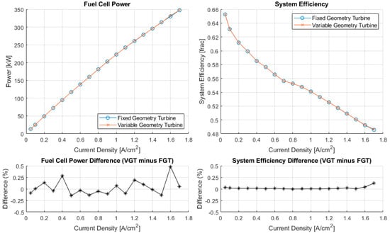 The results from the 1D modelling indicate that fuel cell stack power is very similar whether an FGT or a VGT is used. This is shown in Figure 6, the lower left portion of which shows a less than 0.5% difference in stack power across the range of current density operating points with the use of an FGT or a VGT. The data also show that the choice of an FGT or a VGT subsequently has a negligible effect on overall system efficiency: Figure 6 shows a less than 0.25% increase in system efficiency when using a VGT, as shown in the lower right of the figure.