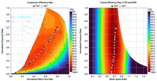 The very similar system performance data—fuel cell power and overall system efficiency—when using either turbocharger are due to two main factors: fundamental turbo design, such as size, and turbine operating point, such as speed. The fundamental turbine design was purposefully kept the same in this study to ensure the effect of a variable nozzle gap was isolated. However, the turbine operating points were found by the boundary condition optimisation exercise, aiming to maximise overall system efficiency. This was conducted independently for the FGT and VGT to assess if their optimal operation differs because of their different air system controls. It was found that the optimised operating points for the two turbos are similar despite their different control capabilities, as shown in Figure 7, where the FGT and VGT operate along the same curve for much of the operating range. A slight divergence is noticeable at the final two points, representing 1.6 A/cm2 and 1.7 A/cm2, where the VGT begins to curve downward, more closely following the peak efficiency curve of the compressor. It is also noticeable from these plots that the operating curve closely follows the peak efficiency curves of both the compressor and turbine, demonstrating that the compressor and turbine are well matched to each other as well as to the fuel cell requirements.