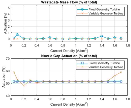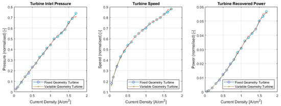 It was also found that VGTs offer a potential benefit in that they are less sensitive to the operating point, maintaining high efficiency when the cathode air flow, pressure, or both are sub-optimal. Despite our differences in approach, these results correlate well with the findings of Filsinger et al. [21], who also found that VGTs were more tolerant when the operating point was compromised. It follows from this that VGTs might offer potential efficiencies for transient loads, which is a suggested area for future work.