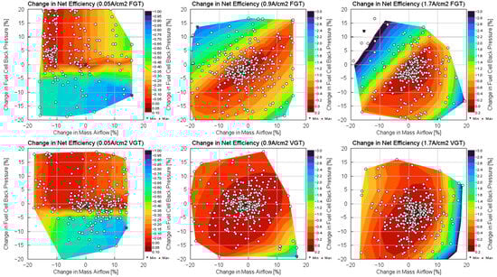 Whilst the optimal boundary conditions are very similar for the two turbines, the VGT exhibits a lower reduction in fuel cell system efficiency when operating under sub-optimal boundary conditions. The contour plots in Figure 10 show the inlet pressures vs. air mass flow rates during the optimisation exercise, with the colours representing the resulting fuel cell system efficiency. The upper three plots represent the system using the FGT, and the lower three represent the VGT. From left to right, there are three current density operating points: 0.05 (idle), 0.9 (mid), and 1.7 A/cm2 (high). It can be seen that the high-efficiency areas are larger in the VGT plot, showing less degradation in performance in sub-optimal operating conditions. This suggests greater resilience if operating in compromised conditions, such as those due to inadequate maintenance or high altitudes. In contrast, the FGT shows a more sudden drop in system efficiency under sub-optimal conditions. These plots illustrate a vital, practical difference between the FGT and VGT under real-world conditions that is not immediately apparent from the ideal, optimised results.