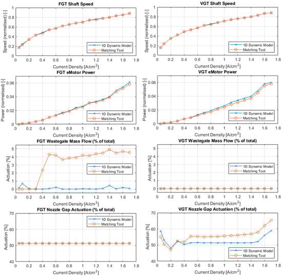 There is very good agreement in the results of the two models. In the FCMT results, the performance of the FGT and VGT appears to be very similar, validating the same observation in the 1D results. Figure 11 compares the following results from the two modelling approaches: shaft speed, e-motor power, wastegate flow, and nozzle gap actuation. The FGT is shown in the left figures, and the VGT on the right. It can be seen that the 1D and FCMT models predict almost identical shaft speeds, resulting in similar e-motor power. The largest percentage difference between the two models occurs in the VGT e-motor power data at 0.8 A/cm2, where the normalised power is approximately 10.5% greater for the 1D model. Since the models predict similar trends in the data and have different levels of modelling detail, this is considered acceptable.