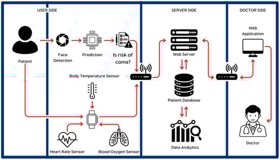 Technology is advancing at a rapid pace in today’s world. The Internet of Things (IoT) will help devices connect and share information. The IoT is viewed not as a network of computer systems, but as a system of embedded devices. The more devices are connected, the more important IoT technology becomes []. For example, to enable these devices to communicate with other systems or devices in the network to reuse the information, radio frequency identification (RFID) devices and sensors (Sensors) are integrated. This gives rise to wireless sensor networks (WSNs) that transmit data with the IoT []. Additionally, IoT technology has been adapted for various research applications in healthcare and wearable devices. These include smart home systems for the elderly, which use sensors to monitor health and support independent living []; e-textiles with wireless sensors for tracking physiological parameters and patient location in hospitals []; smart shoes that measure foot pressure during daily activities []; and health monitoring systems that use wearable sensors to track body temperature and heart rate [,]. Due to remarkable technological advances, artificial intelligence (AI) has become increasingly integrated into healthcare and medical sciences []. An assessment of an AI framework within the healthcare sector in the UAE is focused on improving patient outcomes through the application of techniques such as machine learning and computer vision []. A previous study discusses the role of AI in pandemic management, emphasizing past research on predictive modeling and diagnostics [].