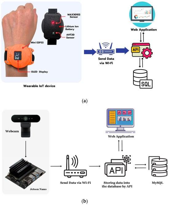 Architectural design (a), wearable IoT (b), and AI camera devices.
