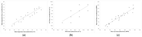 The relationship of the health data measured by wearable and medical devices (a), body temperature (b), blood oxygen (SPO2) (c), and heart rate.