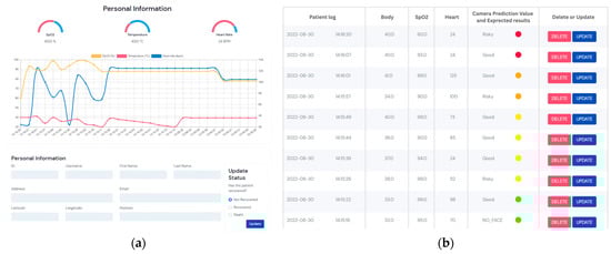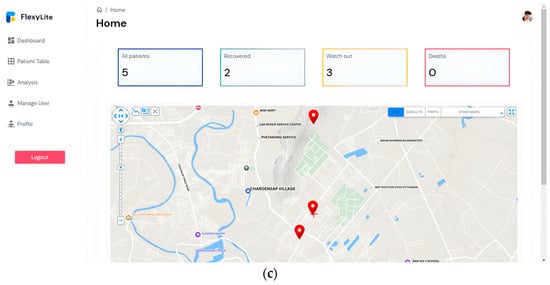 The results of the dashboard: (a) status of patient, (b) health information details, and (c) risk level.