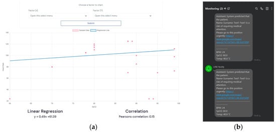 The results from the system: (a) correlation and linear regression analysis, and (b) notification via the LINE application.