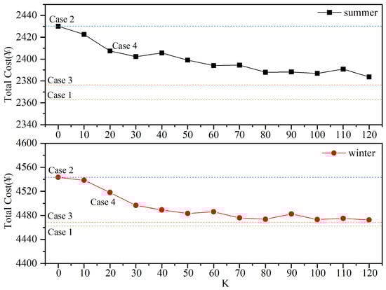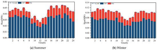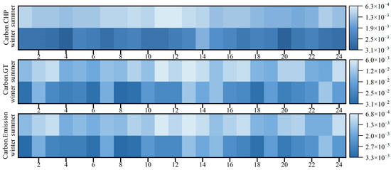 The case study is based on a residential building in a community located in Northwest China, from which the output of PV&WPP is chosen [30]. The values of the main parameters involved in the tested building system are listed in Table 2. The maximum capacity of ES is set to be 2 MWh. Additionally, we assume that the market prices for electricity and gas remain constant at 600 CNY/MWh and 2.5 CNY/m3, respectively, with the marginal cost of renewable energy being zero, and the curtailment of wind and solar power will be penalized based on the electricity price. To reflect the energy dispatch results under different load requirements, we select two typical days from summer and winter for study. At the beginning, we set , and the price of the carbon market is 90 CNY/t. We cluster the dataset including 1094 prediction error samples obtained from historical forecast data into 10 subsets. The electricity and heat loads for the two typical days are shown in Figure 4. It is worth noting that the heat load in summer mainly comes from domestic hot water, while in winter, it also includes the indoor heating load.