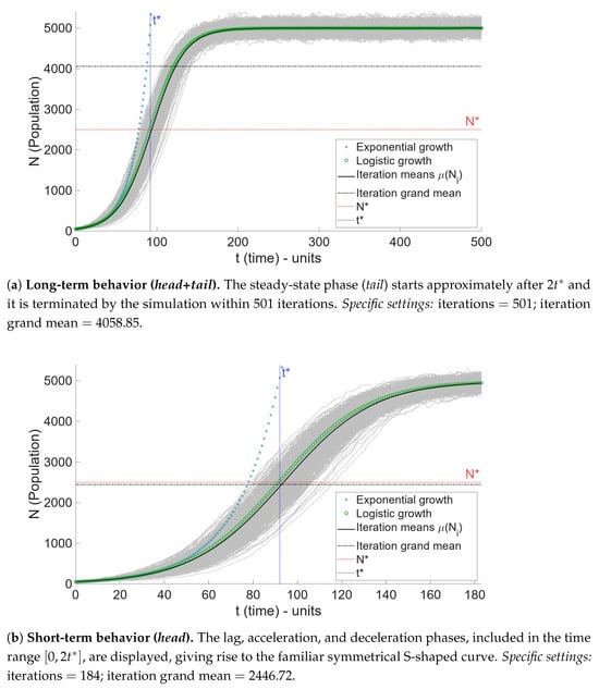 We ran the simulation system 1000 times, with the parameter settings that resulted from the exploration and tuning phase of the pipeline, as thoroughly explained in Section 4.3. We focused on both the long-term (Figure 3a) and short-term (Figure 3b) behaviors of the system, computing the values to capture the trends of the simulated growth. The iteration grand mean of the long-term plot (∼4059) moved closer to L (the carrying capacity), while it was almost at the inflection population = 2500 (∼2447) in the short-term plot.
