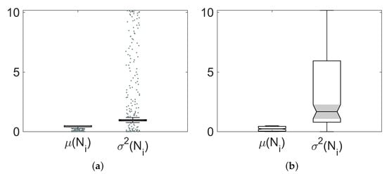 Box plot of the iteration means and variances . (a) Long-term behavior: . The steady-state phase of logistic growth () is included, turning the iteration means of the exponential phase into outliers, while the median of approaches L. (b) Short-term behavior: . The steady-state phase is excluded, resulting in the absence of outliers, while the median of decreases towards the inflection population. The median of increases from (a) to (b), where the sigmoid symmetry is restored. Values on the y axis need to be multiplied by .