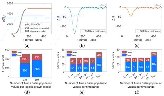 Comparison between continuous (CM) and discrete (DM) model fittings of the iteration means. (a) Overview of CM and DM fitting of the experimental values; (b) difference in population (N) between and CM per time unit; (c) difference in population (N) between and DM per time unit; (d) comparison of CM and DM numbers of population (N) values belonging (true) or not (false) to CIs; (e) same comparison, within CM, per time range; (f) same comparison, within DM, per time range.