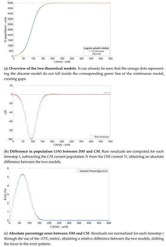 In this way, we can compare DM with CM across time units, taking into account the current population of the mathematical model underneath the proposed simulation, normalizing each deviation with respect to its continuous reference. We thus obtain a clearer representation of the error pattern, given that the residuals are now properly scaled, differently from Figure 6b, where the residuals have their raw values. The reaches its maximum value at iteration , where and (Figure 6a), with an error of , while (Figure 6b), which is not the greatest raw deviation from . This additional metric shows a slightly different V shape that loses its symmetry in favor of an initial linear deviation trend. Rounding errors are absorbed earlier in time and stabilization around the carrying capacity happens similarly, shedding more light on the constitutive discrepancy between the two theoretical models of logistic growth.