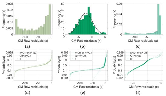Discrete master equation simulation. (a) CM histogram plot of the head (short-term) raw residuals, time range: ; (b) CM histogram plot of the head+tail (long-term) raw residuals, time range: ; (c) CM histogram plot of the tail (steady-state only) raw residuals, time range: ; (d) CM normal probability plot of the head, NRSME indicator: ; (e) CM normal probability plot of the head+tail, NRSME indicator: ; (f) CM normal probability plot of the tail, NRSME indicator: .