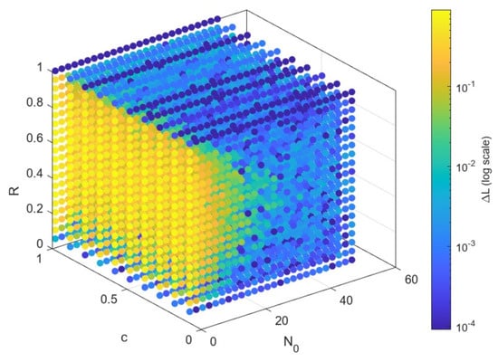 To visually determine how each simulation parameter affected the distance of the stochastic model from the mathematical one, we produced a four-dimensional plot, represented by Figure 9, where points represent the absolute value of the difference () between the theoretical and observed carrying capacity L, scaled by the theoretical L, for each setting of , c, and . In this way, we obtained weighted differences, comparable with each other, given that the theoretical L ranged from 5000 to 500. We recall that the last 200 iterations out of 500 were used to compute the observed L, i.e., the grand mean of 200 values. The range of values, depicted by color shading as the 4th dimension, is in logarithmic scale to accentuate the “yellowish” half-circle pattern that can be detected in each vertical section created by c, suggesting that lower values of lead to a higher , independently of c and R. This could be explained by the exponential growth phase: if not enough creatures exist, reproduce, and balance out the dead ones, the population could become extinct very quickly. Out of 100 simulations, the majority could reach 0 as the current before even reaching the inflection time. Extreme values of R (blue dots), or at least those symmetrically distanced from the center values (e.g., values far from R = and D = ), seemed to imply the shortening of towards 0, while no significant effect was seen on the outcome because of parameter c’s variation.