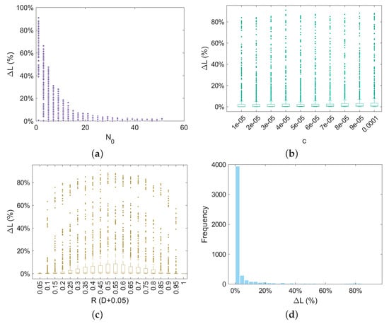 The pairwise relationship of as a percentage with each parameter setting is illustrated by Figure 10. The scatter plot of against (Figure 10a) confirms that at least 30 creatures are necessary to obtain < . Choosing = 51, the upper limit of the range, is a clear tuning outcome. For c and R, two box plots (Figure 10b,c) were produced to evaluate the distribution of within the respective ranges. Regarding c, the 75th percentile is approximately ≤ and the upper adjacent is < for all ten settings, with a median that is very close to , ranging between (c = ; theoretical L = 5000) and (c = ; theoretical L = 500). A greater L probably allows for smoother growth and a more stable steady state: the addition or subtraction of a single creature affects L = 5000 by , compared with when L = 500, the lower limit of the range. Instead, the R variation shows a roughly symmetric pattern. The values of and record upper adjacent limits close to and 75th percentiles > . Probabilities farther from the center yield shorter interquartile ranges. The extremes of R = and R = 1 should be excluded because they, respectively, represent creatures not dying except for overcrowding and those always reproducing. The R value recording the lowest median (of ) is , followed by R = , with a median of . We cannot choose R from an absolute biological prospective: we simulated the growth of an in silico population, so any R and D values are feasible. However, in a real world-scenario, R > is not sustainable. Remembering that is kept constant and the growth rate never changes, this pattern may be due to the stochasticity of the model, so their setting cannot be tuned unambiguously or may not be tunable at all. We speculate that values of R closer to the lower and upper extremes result in a lower probability of simulation failure (), i.e., when the population becomes stuck at 0. For example, in a single-creature and single-iteration scenario, under a value of L so great that death by overcrowding becomes negligible (by approximation), = − − − . If R = or R = , then is for both; otherwise, if R = or R = , peaks at . For R = or R = , = , following the same symmetric pattern of from Figure 10c.