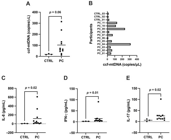 Circulating cell-free mitochondrial DNA (ccf-mtDNA) and inflammatory biomolecules. (A) Levels of ccf-mtDNA and (B) interleukin-8 (IL-8), (C) IL-17, and (D) interferon-gamma (IFN-γ) in samples of PaCa patients (PC) and controls (CTRL); (E) Levels of ccf-mtDNA in the cohort of PaCa patients.
