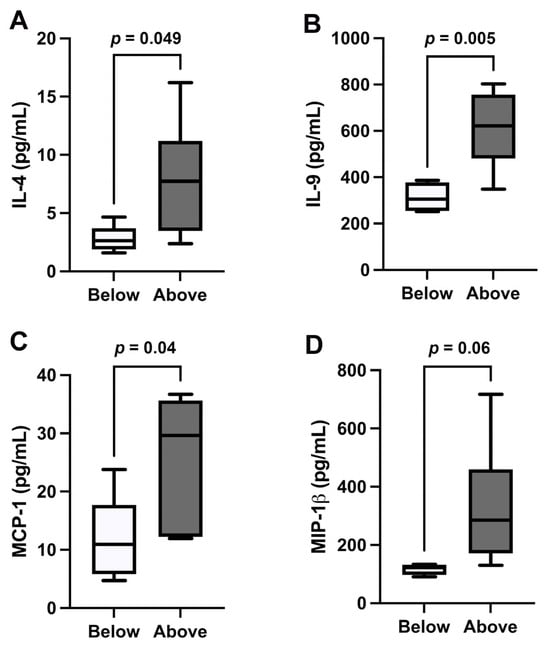 Levels of anti-inflammatory IL-4 and those of proinflammatory IL-9, monocyte chemoattractant protein-1 (MCP-1), and macrophage inflammatory protein 1-beta (MIP-1β) were significantly higher in participants with ccf-mtDNA concentrations above the median value (Figure 2A–D). No significant differences were observed for the remaining inflammatory markers between the two groups (Supplementary Figure S1).