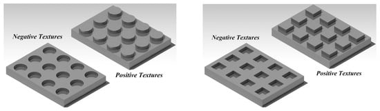 Engineered surface features on bearing shell interiors designed to improve system performance typically divide into two principal forms. Protruding microstructures or positive textures with carefully specified dimensions and shapes are manufactured on the inner bearing surface while corresponding indentations or negative textures with precise depth characteristics are produced within the same surface area [33,42]. Figure 1 illustrates examples of positive and negative textures with different geometric shapes.