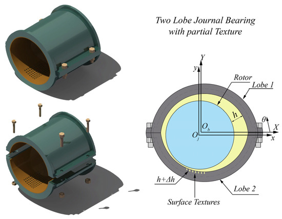 Surface textures created on journal bearing shells, due to variations in the thickness of the lubricating oil film trapped in the bearing clearance space, can contribute to improving the static performance parameters and dynamic stability of the rotor-bearing systems. In Figure 2, a textured two-lobe journal bearing is shown.