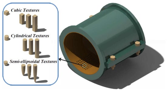 Engineered surface of the two-lobe bearing with cubic, cylindrical, and semi-ellipsoidal textures.