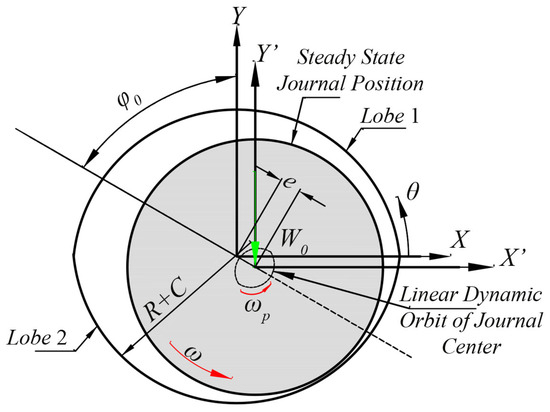 Within Equation (4), symbol n denotes the lobe count of the two-lobe journal bearing, while variables and specify the journal center location in static equilibrium conditions relative to the reference coordinate system. Angle corresponds to the lobe’s centerline orientation with respect to the X-axis. The noncircularity coefficient δ, characterizing the bearing geometry, is determined as the ratio between the smallest radial gap (Cm) and the maximum conventional radial clearance (C) under concentric shaft-bearing conditions.