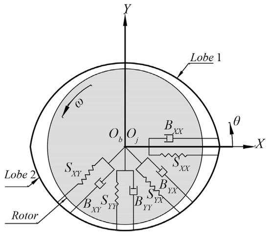 Vibration modeling of the lubricating fluid film in a two-lobe bearing system.
