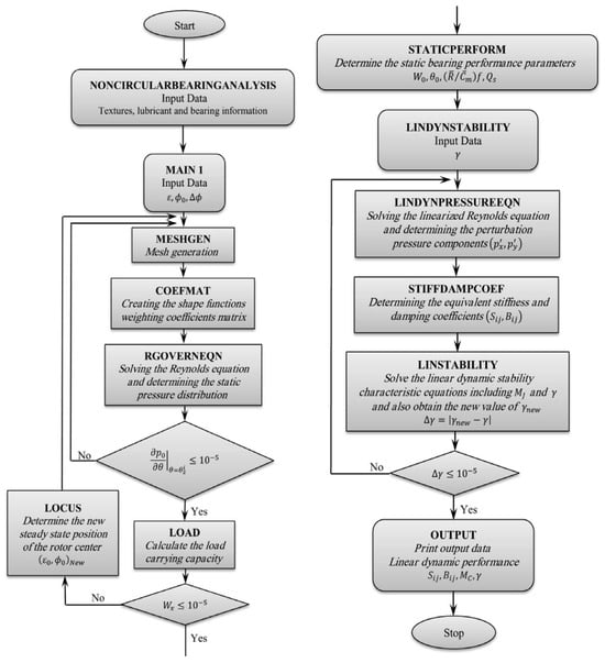 Within this analytical framework, and characterize the rotor center’s oscillatory displacements along coordinate directions referenced to its equilibrium position, with and quantifying their respective magnitudes. The operator Re extracts the real component of complex expressions, where j signifies the imaginary unit (). The parameter γ, known as the whirl frequency ratio, describes the relationship between the angular velocity of the perturbation motion of the shaft center around the static equilibrium point and the rotor’s spin velocity (ω). The dynamic pressure fields across the solution domain are obtained through Equation (11), derived by applying partial differentiation to the nondimensional Reynolds equation (Equation 1) with respect to and , followed by evaluation at null perturbation conditions.