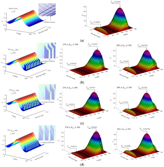 Equation (3) incorporates as the lubricant film dimension separating the rotating shaft and the bearing shell for an untextured circular bearing at all circumferential positions, mathematically described by Equation (4). Furthermore, quantifies the depth of engineered surface textures—including cubic, cylindrical, and semi-ellipsoidal geometries—patterned on the bearing’s interior surface [14].