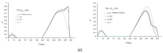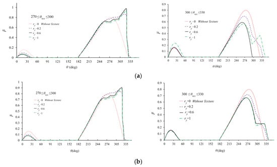 The plotted data demonstrate a progressive attenuation of pressure enhancement in the bearing’s lower lobe relative to plain bearings as texture depth increases within the 270–300° angular sector. Conversely, surface modifications in the 300–330° region initially generate substantial pressure reduction in the lower lobe, with pressure variation magnitudes becoming constrained beyond geometry-specific critical depth thresholds. The results of Figure 10 fundamentally indicate the existence of an optimal depth for each type of investigated textures to maximize bearing performance enhancement. Exceeding this critical depth yields diminishing returns and, in certain cases, performance deterioration. Cubic textures exhibit the shallowest optimal depth, while cylindrical and semi-ellipsoidal configurations require progressively greater depths for peak effectiveness. The analysis reveals minimal pressure variation across most texture depths on the primary lobe surface, with more pronounced reductions observed when texturing the 270–300° circumferential segment. This behavior results from the upper lobe’s auxiliary load-bearing function in two-lobe journal bearings, where the lower lobe maintains primary pressure absorption. Consequently, all critical performance metrics in such bearing systems are predominantly determined by the lower lobe’s pressure-dependent characteristics. Figure 10 further confirms that the angular region spanning 270–330° represents the core pressure zone in two-lobe journal bearings, establishing this sector as the optimal location for precision surface texturing applications.