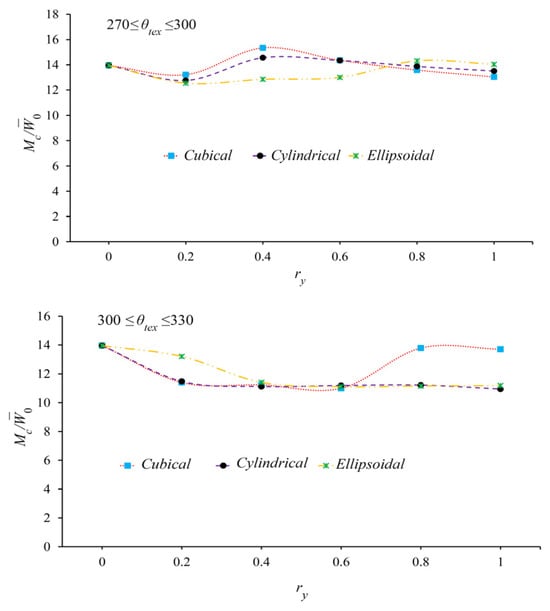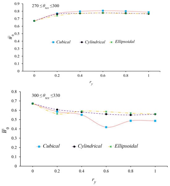 Figure 11 demonstrates how texture depth variations (cubic, cylindrical, and semi-ellipsoidal geometries) affect the load capacity of two-lobe noncircular journal bearings. The data reveal that surface textures within the 270–300° angular region enhance bearing load capacity across all geometry types. This improvement occurs primarily at shallow penetration depths, with diminishing returns observed beyond optimal depth thresholds. Cubical textures generate the most substantial load capacity enhancement among the three geometries examined. However, relocating textures to the 300–330° sector reverses this trend, with cubic textures exhibiting the most significant load capacity reduction under these conditions.