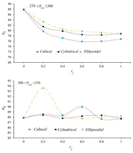 Figure 12 demonstrates how strategically oriented surface textures of varying geometries influence rotor attitude angle within two-lobe bearing clearances across different penetration depths. The graphical data reveal distinct behavioral patterns for textures positioned at two circumferential locations (270–300° and 300–330°), identified as strategic angular sectors for surface modification in such rotor-bearing systems. Analysis of Figure 12 indicates that texture implementation within the 270–300° region induces significant attitude angle reduction, though this effect diminishes beyond certain depth thresholds. Notably, cubic textures exhibit the most pronounced influence on angular orientation among the three geometries studied. In contrast, texture placement in the 300–330° region produces irregular attitude angle variations that lack consistent correlation with increasing penetration depth.