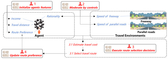 Then, depending on the simulation demand in each round, the degree of rationality of the agents, the speed of the freeway, and the speed of the national and provincial arterial roads are set by the control. In this study, the degree of rationality is set in the interval of 0–1, with 0 indicating that individuals are completely irrational, and the travel route selection only considers the route preference; and 1 indicating that individuals are completely rational, and the travel route selection only considers the travel cost. The freeway speed has been set between 70 km/h and 120 km/h and the parallel road speed has been set between 50 and 80 km/h.
